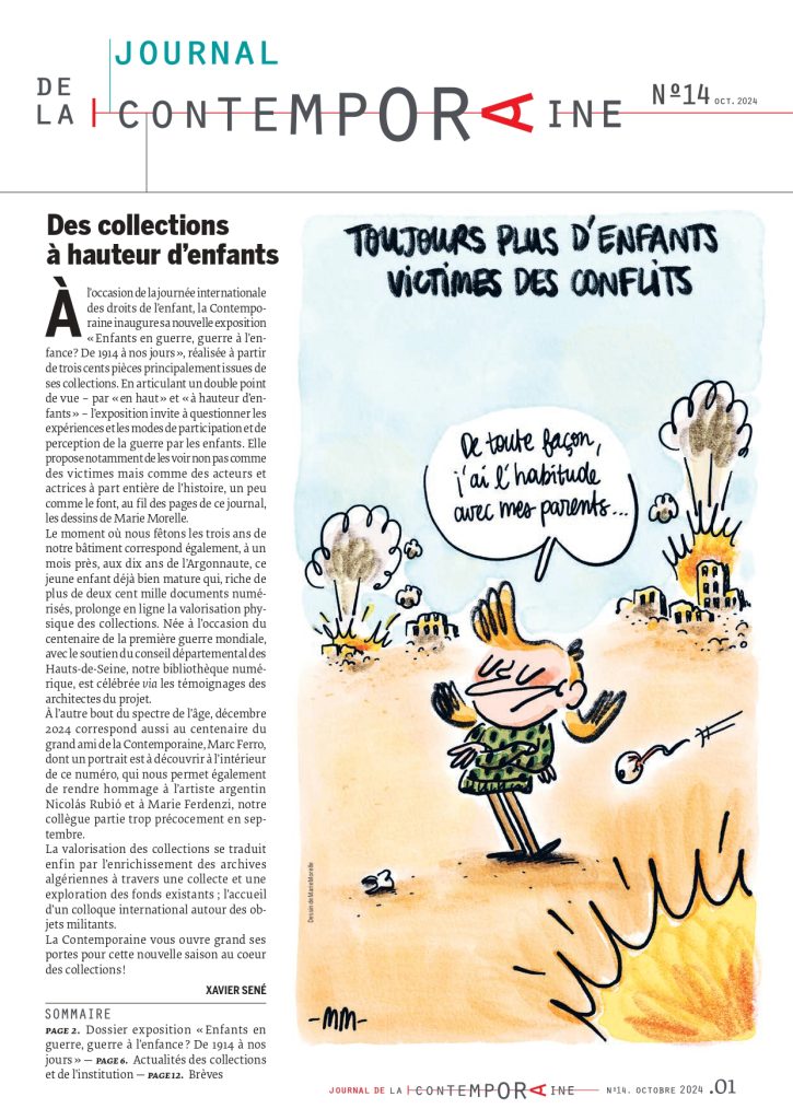 L’Argonnaute est la bibliothèque numérique de La Contemporaine et tire son nom d’un journal des tranchées. Ce portail vous donnera accès à plus de 200 000 documents numériques ou numérisés par La Contemporaine : imprimés et pièces d’archives, dessins, peintures, photographies, affiches et objets, permettant de se plonger dans les sources de l’histoire du XXe siècle. Pour approfondir vos recherches sur les fonds de La Contemporaine, nous vous invitons à consulter également le catalogue des ressources imprimées et électroniques ainsi que le catalogue des fonds d’archives et collections muséales.